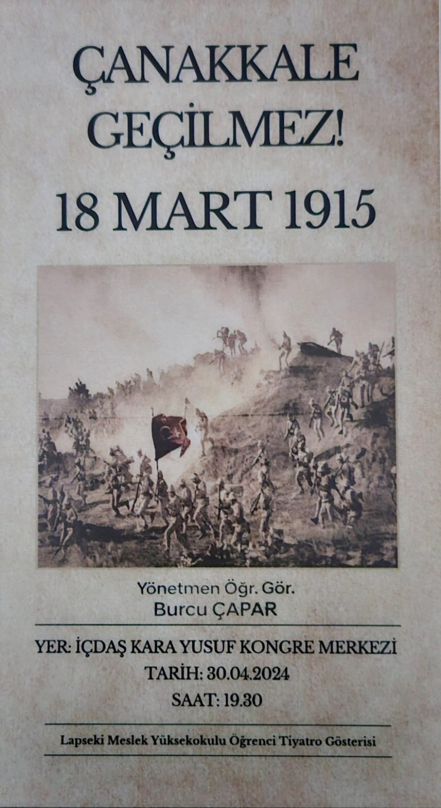 Öğr. Gör. Burcu ÇAPAR yönetiminde Lapseki Meslek Yüksekokulu öğrencilerimizin hazırladığı tiyatro oyunu, 30 Mart 2024 tarihinde İÇDAŞ Kara Yusuf Kongre merkezinde saat 19:30'da sahne alacaktır.